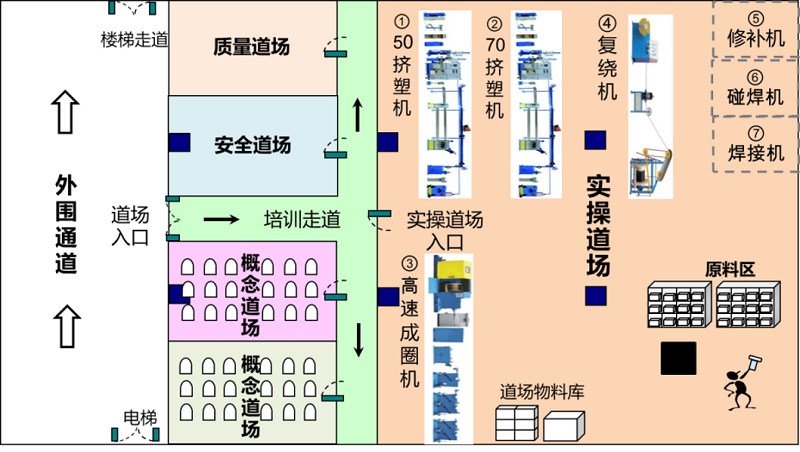 远东大学生产学院致力于打造行业内首家一线员工实训道场,道场分为概念道场、安全培训区、质量培训区及精益实操道场四大培训区域,旨在为公司培养具有发现问题、改善问题的能力、并掌握高水平实操技能的员工。概念道场即理论培训道场,以传统课堂式、案例研讨式、课题式等培训方式,对参训学员从思想认知方面进行工艺理论等知识的教学;安全道场结合人、机、料、法、环,设计危险源识别及预防相关道具,通过安全事故案例进行安全教育;质量道场以质量事故案例警示教育和质量问题产品展示为主,通过系统性的质量培训,培养员工的质量意识,提高员工对产品缺陷的识别能力;精益实操道场主要通过情景模拟教学形式,以道场内的设备进行设备维护、自主保养、快速换模、标准化作业等培训内容,是员工理论培训与实际操作相结合的坚实平台。