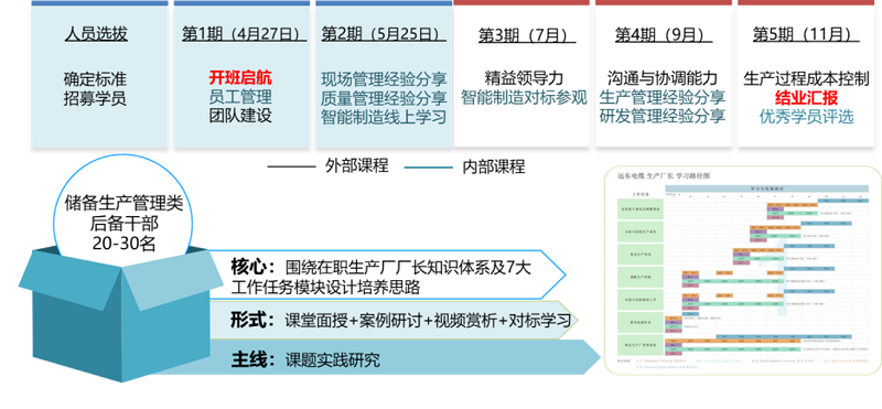 远东于行业内率先引入精益生产”、智能制造”理念,远东大学生产学院针对不同条线、不同岗位导入精益生产各个模块的学习内容,举办有精益厂长特训营、精益班组长特训营、精益标杆游学项目,同时开办了匠师项目-面向中高层管理人员、匠研项目-面向研发人员、匠英项目-面向基层管理人员、匠工项目-面向一线操作类人员。