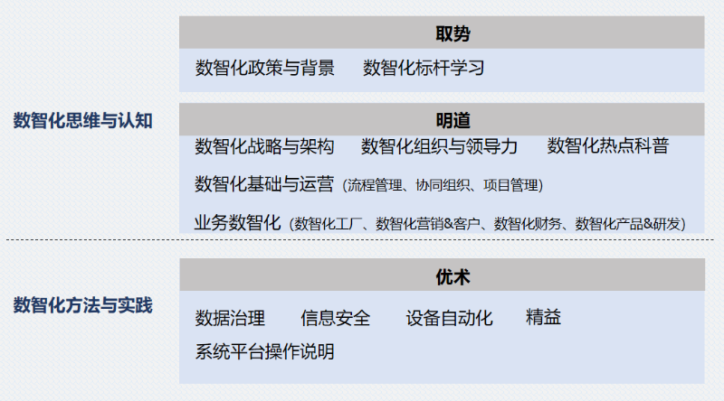 数智化取势项目:了解国家及行业发展态势,通过学习标杆制造业数智化转型案例,与优秀企业对话,全面对标,全面超越。数智化明道项目:通过对远东数智化转型战略的宣贯与实践步骤的分解,对数智化转型总体架构达成共识,通过课程培训给予启发,加速公司数智化转型。数智化优术项目:将垂直行业知识与数智化技术培养相结合,为企业数智化转型输送复合型人才。